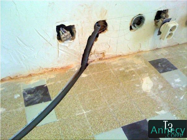 Après avoir réalisé ma saignée à l'aide d'une rénureuse (double disque diamant) et de burins... J'ai pu faire passer ma gaine de 25 (2 circuits -gt; 2 fois 3fils de 2,5mm)