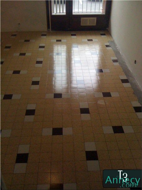 Pour une tenue parfaite du nouveau carrelage, je décape le carrelage à l'aide d'une monobrosse et d'un produit spécial din de chantier (décapage sols carrelés)