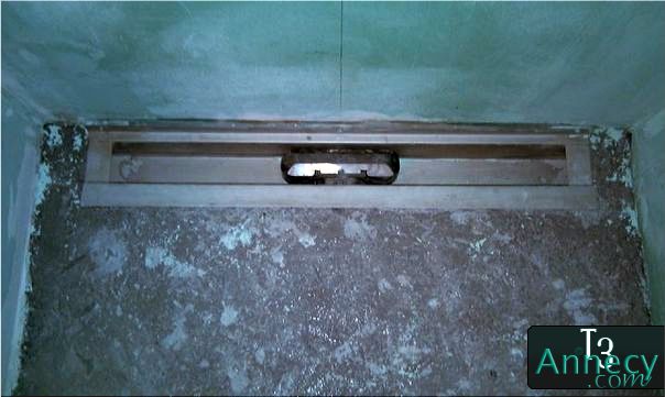Sur le drain encastré dans le sol. Je vais maintenant devoir lisser la pente avec un mortier plus fin.