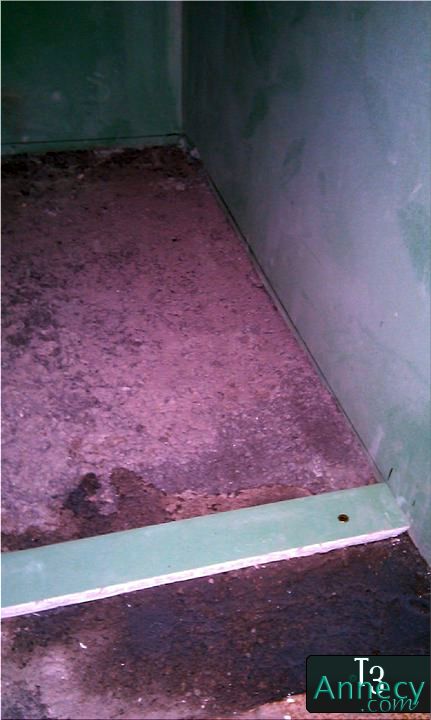 La pente n'étant pas assez raide, je dois réaliser une marche pour relever la partie plate du sol. je dois remonter de 1cm, mais 13mm ça ne change pas grand chose ! Donc je prends une chute que je vis dans le sol pour la caler et l'utiliser de support. Je n'aurai qu'à faire glisser ma règle avec un niveau pour faire un sol parfaitement plat et droit.