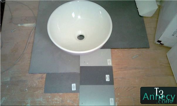 Je pose maintenant le vasque sur le carrelage et la faïence, mais aussi à côté des échantillons de plan de travail.