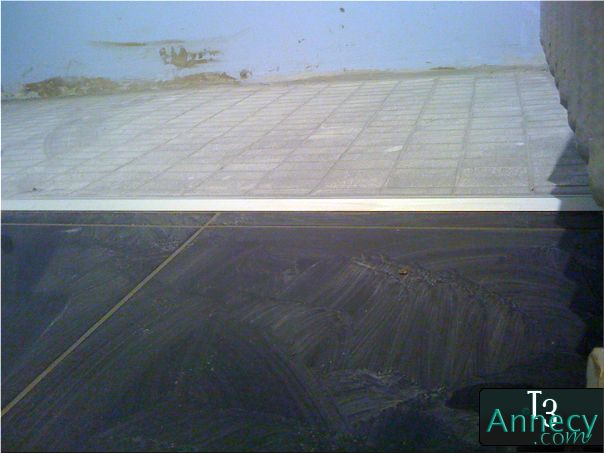 Je rappelle que le seuil a été encastré dans le carrelage, et j'ai fait en sorte que la colle soit sous pression dessous (pas de bulle), j'ai ensuite gratté de façon à avoir une profondeur suffisante pour l'application du joint hydrofuge.
