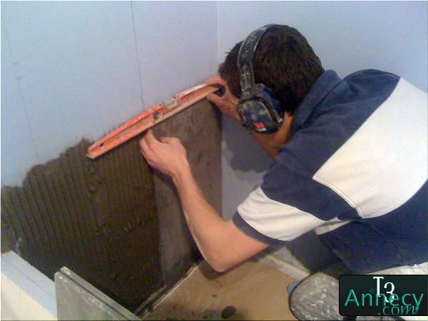 Il faut être méthodique, patient. Niveau à la main, je préfère poser toute la ranger du bas, puis une fois sec, je poserai les autres carreaux.