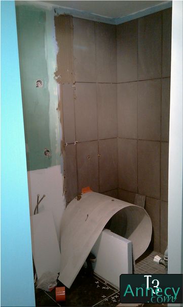 Les carreaux de 30 x 60 cm sont lourds, pas tous à la même taille (des fois des différences de 1mm), 15 minutes par carreaux en moyenne, à vu d'oeil, pas loin de 15 heures de pose de faïence en double encollage
