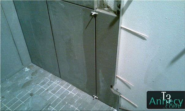 Pour maintenir le carreau de faïence, j'utilise bien-sur les croisillons (4mm ici, 2mm pour la blanche), mais aussi des bouts de cartons, des allumettes, des trombones...