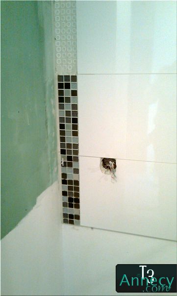 Et voilà, je vous épargne les étapes de collage, on plaque, on enlève la colle entre les carreaux, puis on passe un coup d'éponge partout soigneusement...