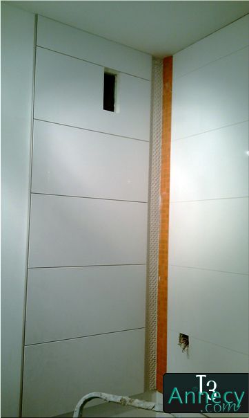 Toujours le même principe, je colle des bandes de plastique (protection de fond d'évier) pour décaler la faïence du mur de 0,5cm