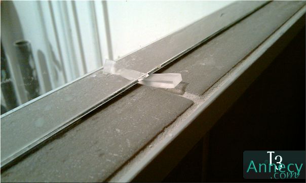 En tout je mettrai 6 cales transparentes comme celle-ci, en plus du joint silicone transparent fait du côté extérieur de la douche.
