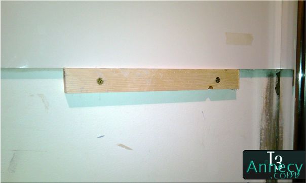 Tasseau de bois pour faire reposer le plan de travail, puis le fixer.