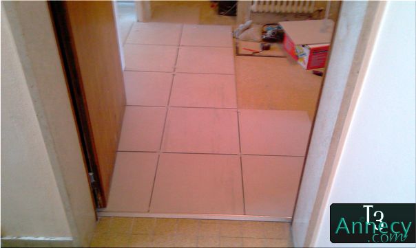 Toujours aucun carreaux posé, mon montage est parfait, ça passe au millimètre partout et ma baguette en aluminium (seuil de passage) est découpée à la bonne longueur.