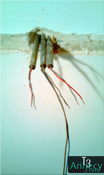 Enfiler un tuyaux de diamètre plus petit entourant les câbles, le temps de couper l'autre tuyaux avec une disqueuse (en prenant soin de ne pas rentrer trop profondément.
