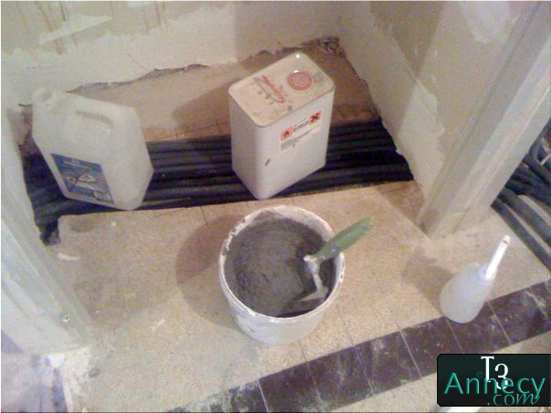 Je plaque les gaînes au sol avec des objets lourds, avant de couler le ciment.