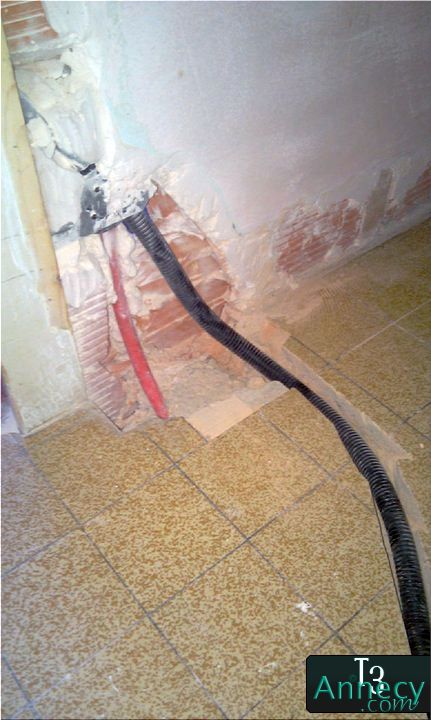 Je passe par les toilettes pour faire passer la gaîne de la futur prise électrique du bureau.