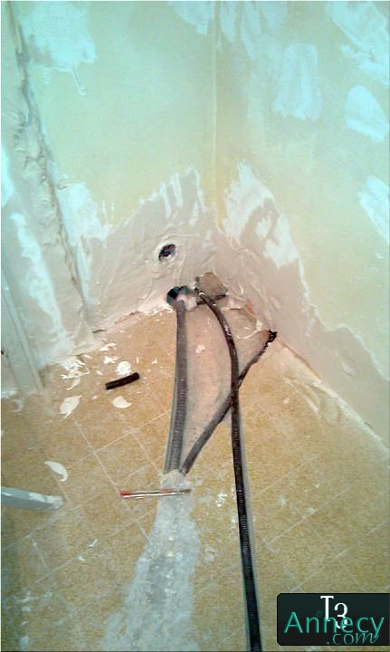 Faut reboucher les trous quand même, scellement des boites de dérivation, notamment une prise qui donne de l'autre côté du mur, qui donne donc sur le hall d'entrée.