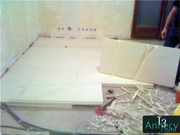 Découpe dans les plaques pour faire passer les gaînes qui sont au sol