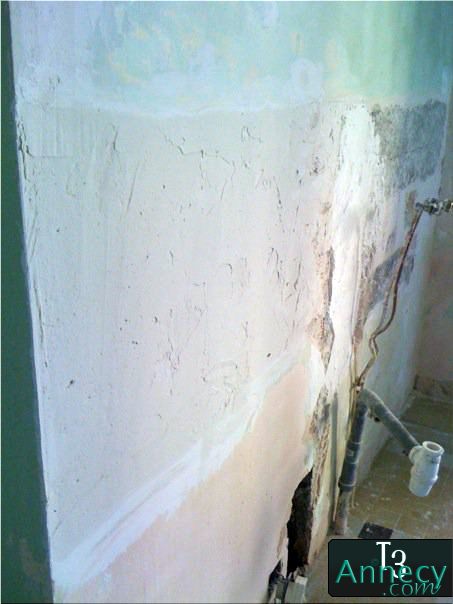 Après avoir enlevé les restes de colle de la faïence, enlevé les morceaux de platre qui ne tenaient plus et agrandit les micro-fissures, je m'essaie à l'enduit de rebouchage.